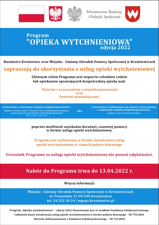 Miejsko - Gminny Ośrodek Pomocy Społecznej w Krośniewicach w związku z przystąpieniem do Programu „Opieka Wytchnieniowa” – edycja 2022, ogłoszonego przez Ministerstwo Rodziny i Polityki Społecznej, finansowanego ze środków Funduszu Solidarnościowego, informuje o rekrutacji uczestników do przedmiotowego Programu.