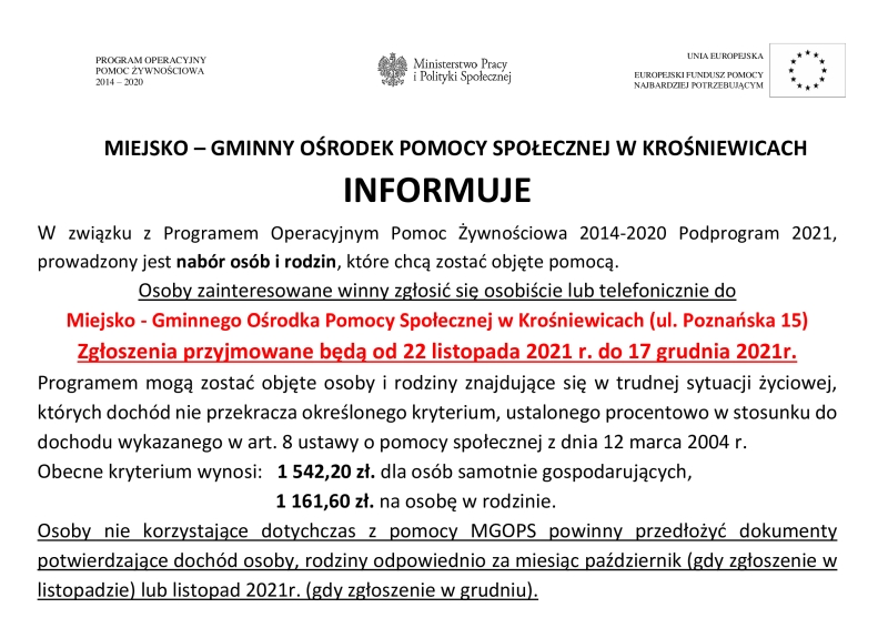 W związku z Programem Operacyjnym Pomoc Żywnościowa 2014-2020 Podprogram 2021, prowadzony jest nabór osób i rodzin, które chcą zostać objęte pomocą.